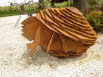 2011Grote openstaande schelp met in- en uit zwemmende vissen gemaakt van plaatmateriaal en schakels van kettingen. Er heeft zich een egale roestlaag gevormd en alles is geolied voor een mooie uitstraling. .